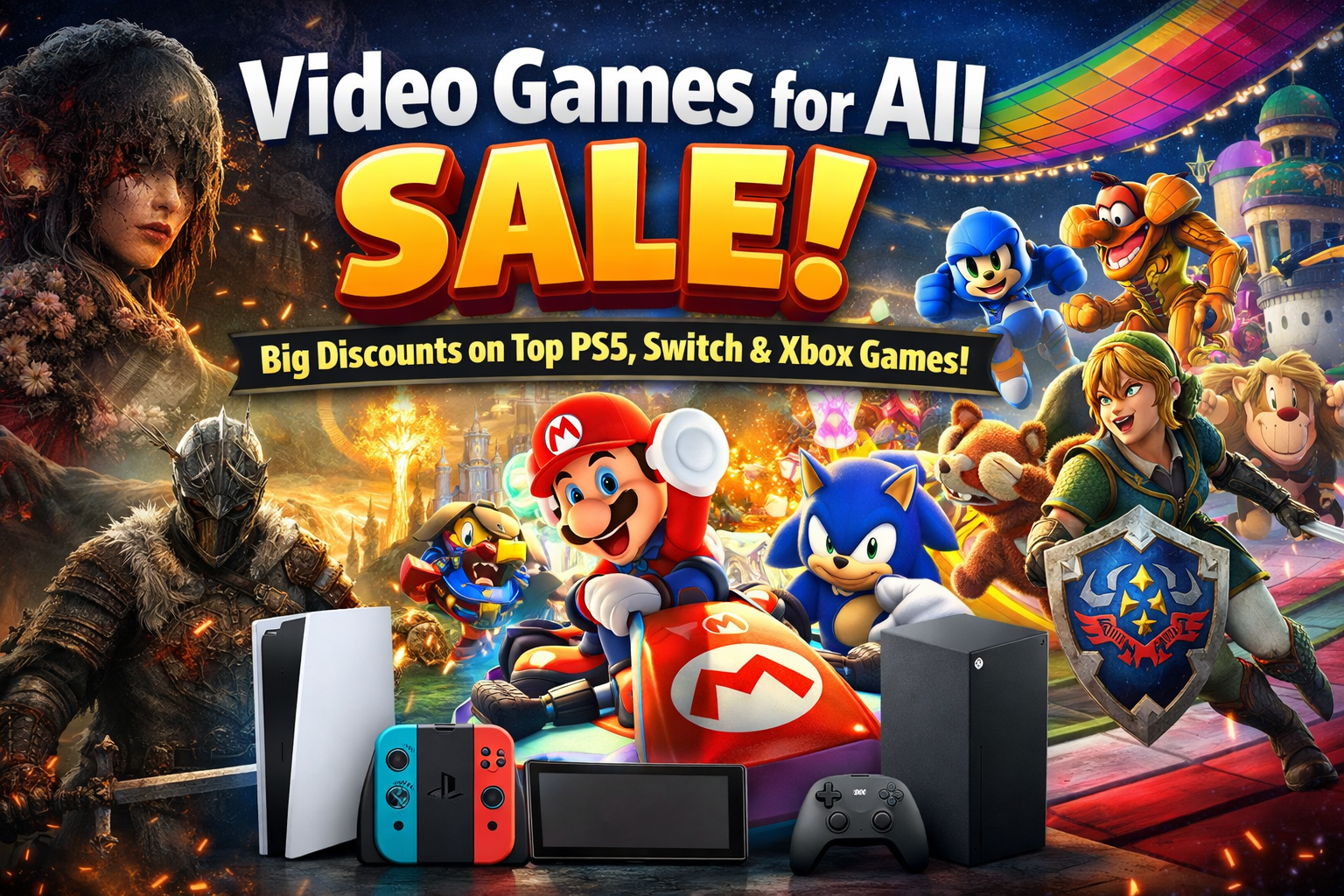 From horror and action RPGs to party fighters and family-friendly racing games, the lineup covers multiple genres — making it one of the most versatile console sales currently available.